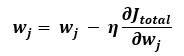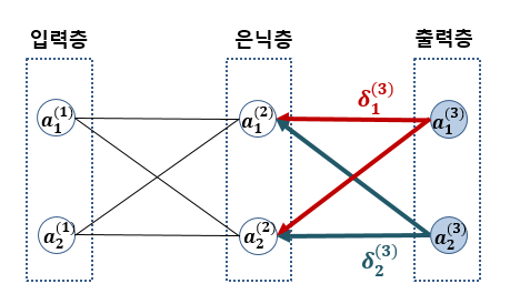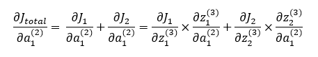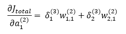 여기서 Jtotal은 해당 노드가 영향을 미치는 오차의 총합입니다. 예를 들면 출력층의 노드 a1(3)에서는 다른 노드의 오차에 영향을 전혀 미치지 않으므로 해당 노드에서 오차인 J1만 따지면 되지만, 은닉층의 a1(2) 노드는 출력층의 a1(3), a2(3) 노드의 오차에 영향을 미치므로 J1, J2 모두 더한 것이 Jtotal 값이 됩니다.