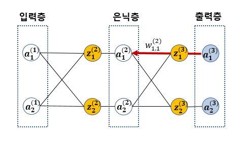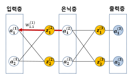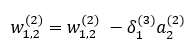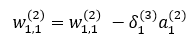 역전파에 의해 업데이트 되는 w1,1(2)는 다음과 같습니다.