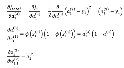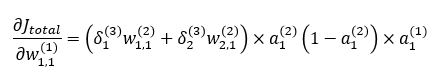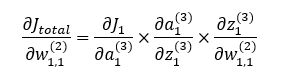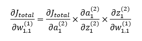 w1,1(1)을 업데이트 하기 위해서 a1(2)에서 Jtotal을 w1,1(1)로 편미분한 값을 계산해야겠지요? 앞에서 적용한 것과 마찬가지로 미분의 연쇄법칙을 활용하면 다음과 같은 식이 됩니다.