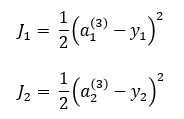 우리의 목표는 J1과 J2의 값이 최소가 되도록 w1,1(1)~w2,2(2)를 결정해야 합니다.