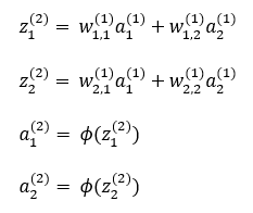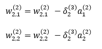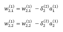 w2,1(1), w2,2(2)에 대한 업데이트 식을 나타내면 다음과 같습니다.
