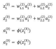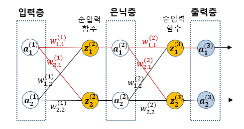 이와 같이 입력층의 a1(1), a2(1)을 시작으로 출력층의 a1(3), a2(3) 값이 출력되는 과정을 순전파(feedforward)라 부릅니다.