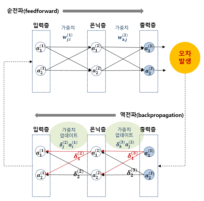 역전파란 역방향으로 오차를 전파시키면서 각층의 가중치를 업데이트하고 최적의 학습 결과를 찾아가는 방법입니다.