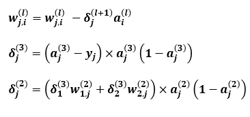 여기까지 서술해보니 뭔가 규칙성이 보입니다. 출력층에서 은닉층으로 역전파를 통해 전달되는 값이 결국 δ1(3) 과 δ2(3)뿐이더라도 관련된 가중치를 업데이트하는데 충분하다는 것을 알 수 있습니다.